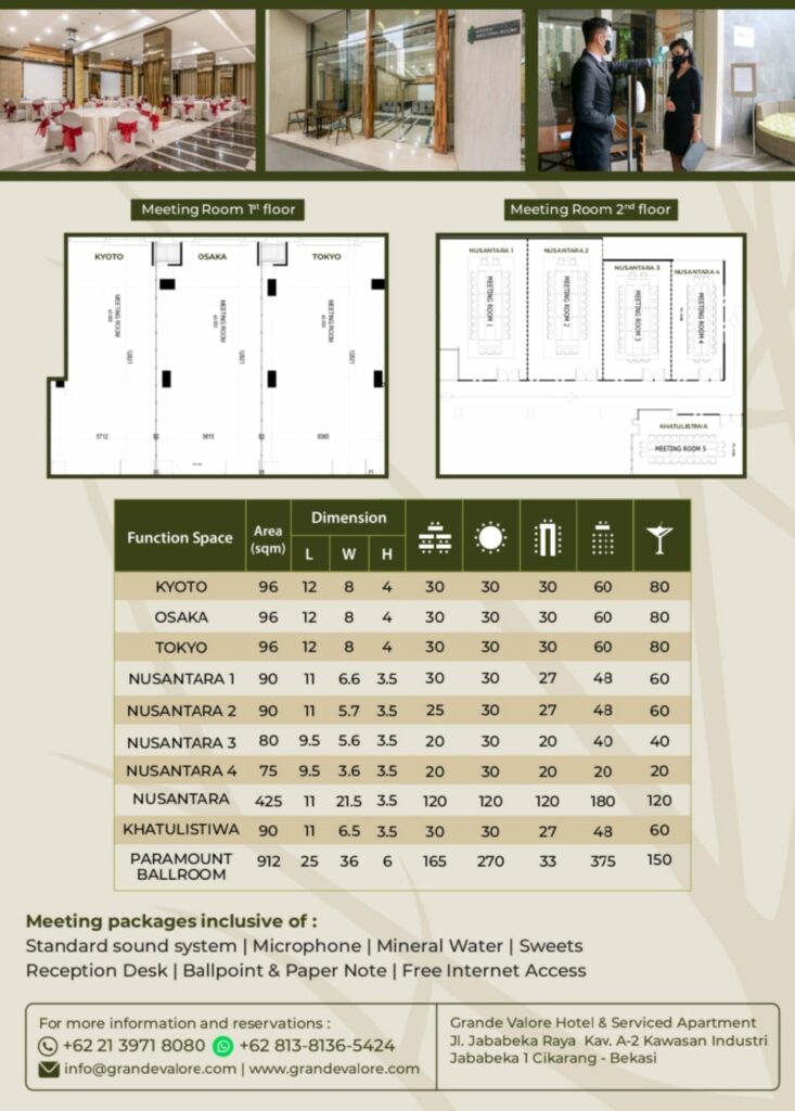 Selain meeting room Nusantara dan Khatulistiwa, Grande Valore Hotel & Serviced-Apartment juga memiliki meeting room lainnya seperti Kyoto, Osaka dan Tokyo, yang masing-masing memiliki luas 96 Meter persegi. Kami juga memiliki Paramount Ballroom dengan luas 912 meter persegi yang mampu menampung hingga 350 orang. Menjadikan ruang meeting di Grande Valore Hotel & Serviced-Apartment meeting room hotel terbaik di Cikarang.